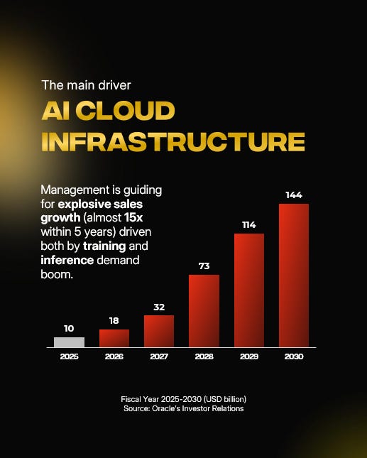 AI Inference: Larry Ellison called it the “tsunami approaching”: once models are trained, the deployment phase (inference) becomes an even bigger market. As more and more enterprises will implement AI-driven applications, Oracle is fighting to dominate the infrastructure backbone.